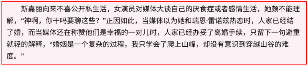 对于这段来去匆匆的婚姻,向来不愿公开私生活的斯嘉丽,只留下了一句话:“婚姻是一个复杂的过程,我只学会了爬上山峰,却没有意识到穿越山谷的难度。”