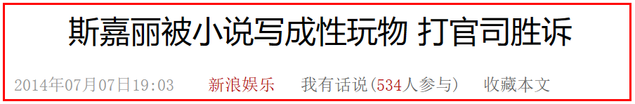 2014年7月,斯嘉丽状告法国作家格列瓦·迪拉考特,因为对方在小说《The First Thing We Look At》中,塑造了一个和斯嘉丽非常相似的角色。