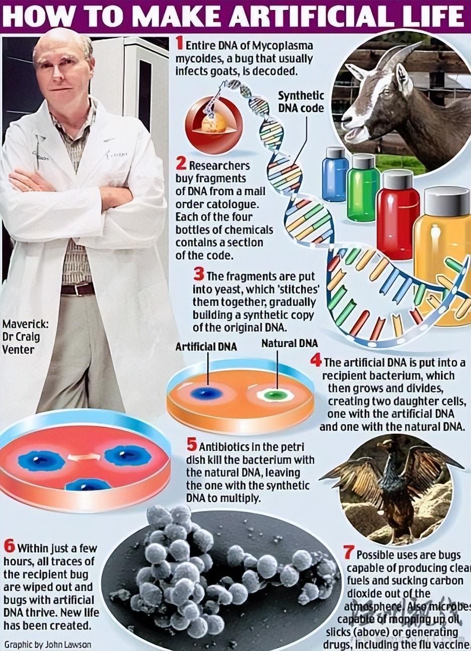 科学家们首先选取一种名为丝状支原体的细菌,对其基因组进行解码并复制,产生人造的合成基因组。然后,将人造基因组移植入另一种称为山羊支原体的细菌,通过分裂和增生,细菌内部的细胞逐渐为人造基因所控制,最终成为一种全新的生命。