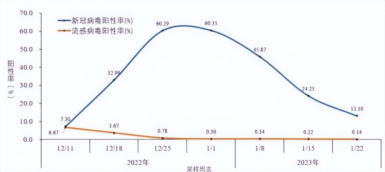 网络实验室对流感样病例标本同时进行新冠病毒和流感病毒检测,从2022年第49周(12月9日),新冠病毒阳性率开始逐渐增加,在第51和52周期间达峰值后开始波动下降;同期流感病毒阳性率则逐步降低,至12月下旬降至极低水平(图2-5)。
