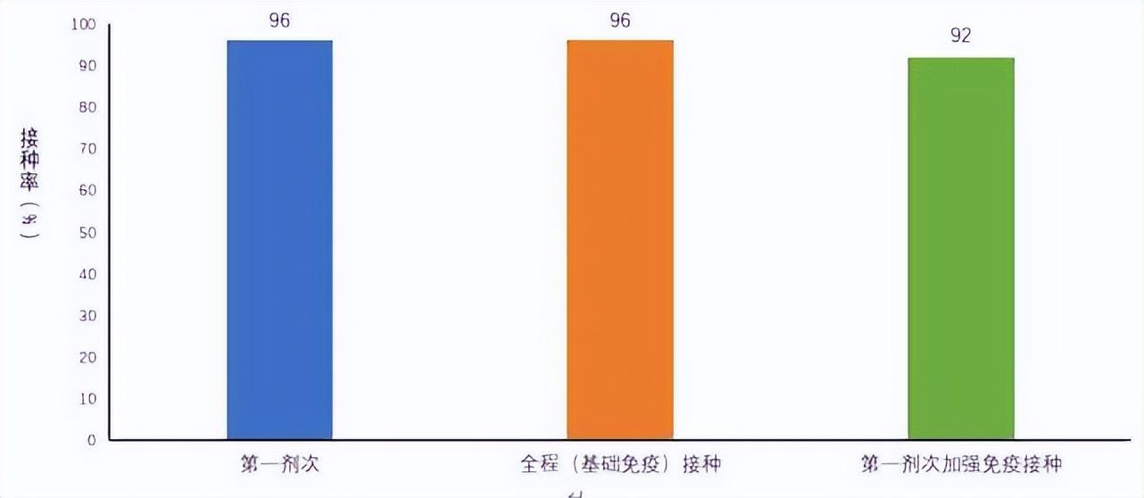 根据近期开展的老年人专项摸底调查数据,60岁以上老年人接种覆盖人数占老年人群的96%。全程接种、第一剂次加强免疫接种人数分别占符合接种时间间隔老年人群的96%、92%(图5-3)。