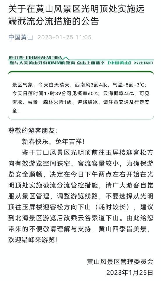 1月25日,据“中国黄山”公众号消息,黄山风景区管理委员会发布公告称,鉴于黄山风景区光明顶前往玉屏楼迎客松方向有效游览空间狭窄、客流容量较小,为确保游览安全顺畅,决定在25日下午两点左右开始在光明顶处实施截流分流管控措施,请广大游客自觉服从景区管理,调整游览线路,不要选择从光明顶往玉屏楼迎客松方向下山(耗时较长),建议到北海景区游览后改乘云谷索道下山。